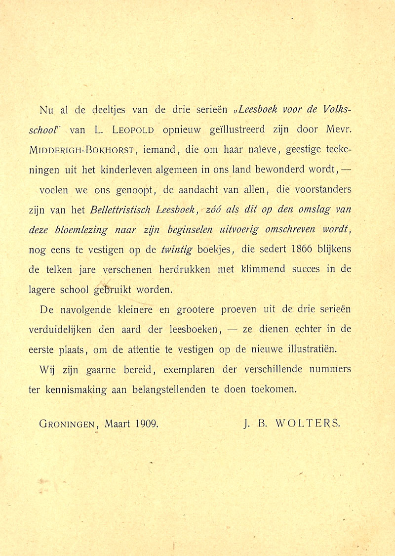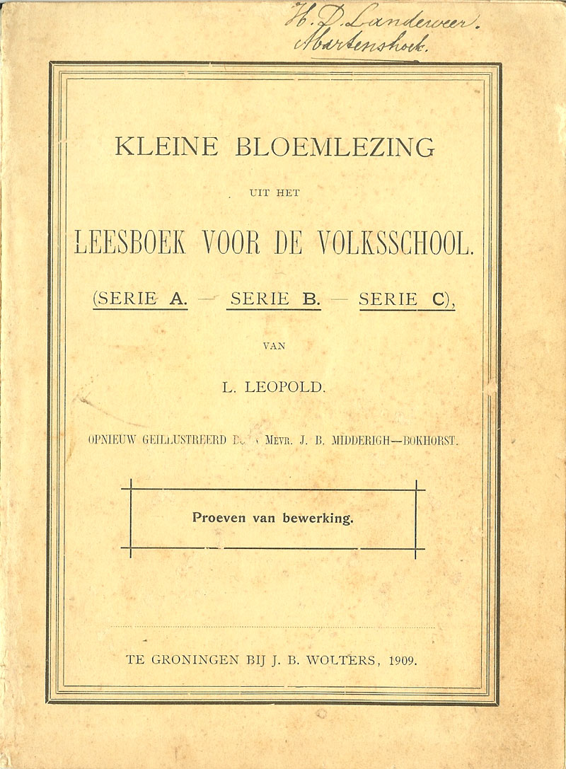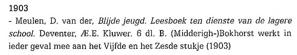 Blijde jeugd (1903) Leesboek ten dienste van de lagere scholen door D. van der Meulen. Uitgegeven bij Æ. E. Kluwer - Deventer 6 delen Vanaf ca 1907 een nieuwe serie van 6 delen Voorafgaand een serie van 6 delen Blijde Kleuters Rond 1920 twee (?) deeltjes bewerkt door A.Jansen voor N.O.-Indië met tekeningen van Tj. Bottema Welke bijdragen van B.Midderigh-Bokhorst zijn is me (nog) niet bekend. In het Historisch Jaarboek Vlaardingen 2012 wordt door Ellen Boonstra-de Jong en Erika Verloop aangegeven dat ze in ieder geval meewerkte aan het Vijfde em Zesde stukje. ![]() ![]() |