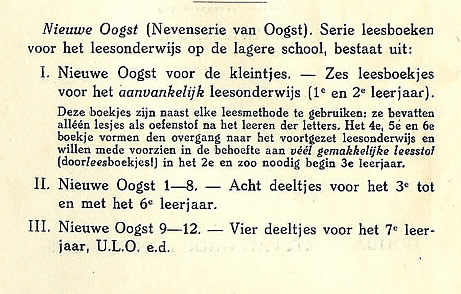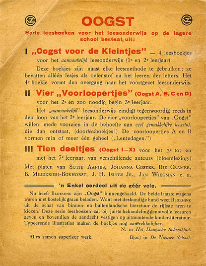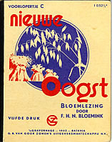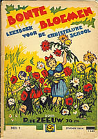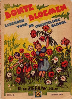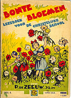 Bonte Bloemen 1926 Serie leesboeken voor de school met den Bijbel door P.de Zeeuw J,Gzn. Twaalf deeltjes, uitgegeven bij G.B. van Goor Zonen, Gouda. In een los boekje 'Ten geleide' geeft de auteur opmerkingen en mededelingen betreffende deze serie. Vanaf de 3e druk en opnieuw vanaf de 7e druk zijn er flink wat wijzigingen aangebracht. Uiteraard doorgevoerde spellingswijzigingen maar ook weglatingen en toevoegingen van verhalen en gedichten. Ook de omslag heeft vanaf ca de 3e of 4e druk een metamorfose ondergaan door de nieuwe tekening van Henk Poeder. Illustraties van de serie door o.a. J.H. Isings, B.Midderigh-Bokhorst, O.Verhagen, Ella Riemersma e.a. Afmetingen boekjes: 18,5x13,5 |