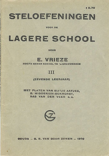 Steloefeningen voor de lagere school 1920 Door E.Vrieze, hoofd eener school te 's-Gravenhage. Waarschijnlijk drie deeltjes. Uitgegeven bij G.B. van Goor Zonen - Gouda. Met platen van Sijtje Aafjes, B.Midderigh-Bokhorst (pagina 79 en 91), Bas van der veer e.a. |